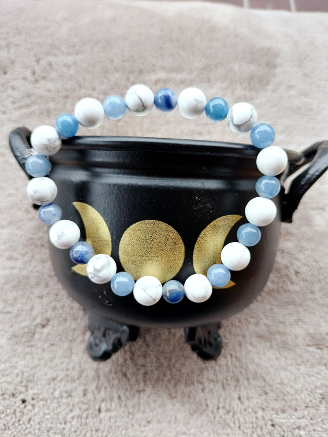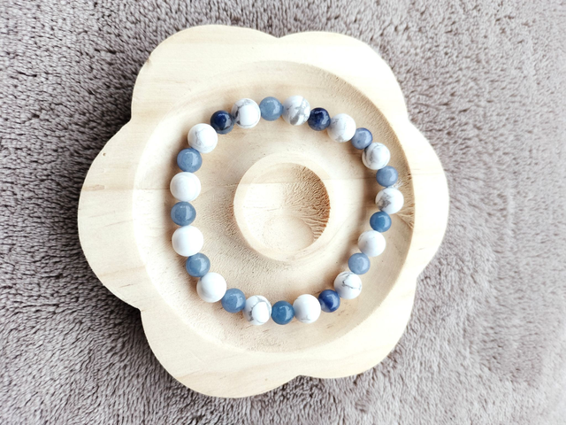 Ce bracelet est composé de perles pierres naturelles de Howlite et de pierre d'Aventurine bleu, douce association pour vos nuits paisibles.